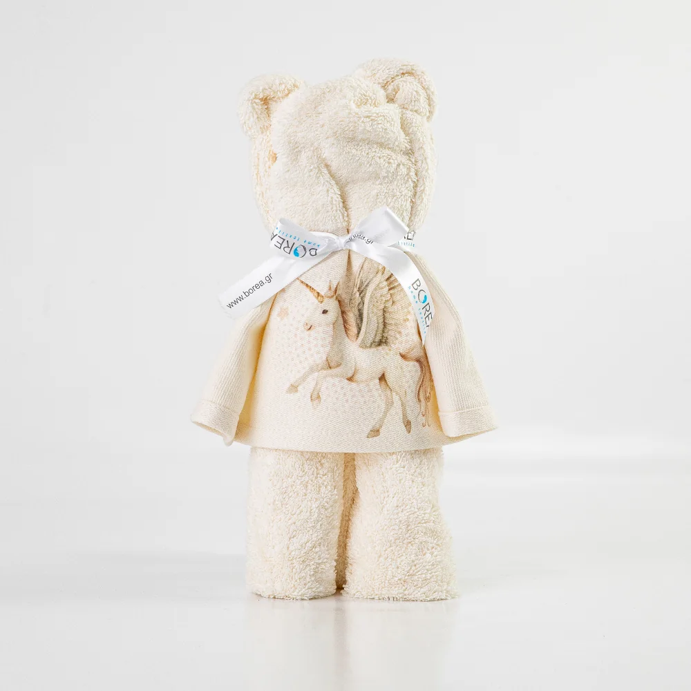 Πετσέτα προσώπου, από ύφασμα φροτέ πενιέ, 100% βαμβακερό, μονόχρωμο, με ψηφιακή εκτύπωση, σχέδιο μονόκερος, σε συσκευασία/σχήμα αρκουδάκι.Διατίθεται σε 2 χρώματα.