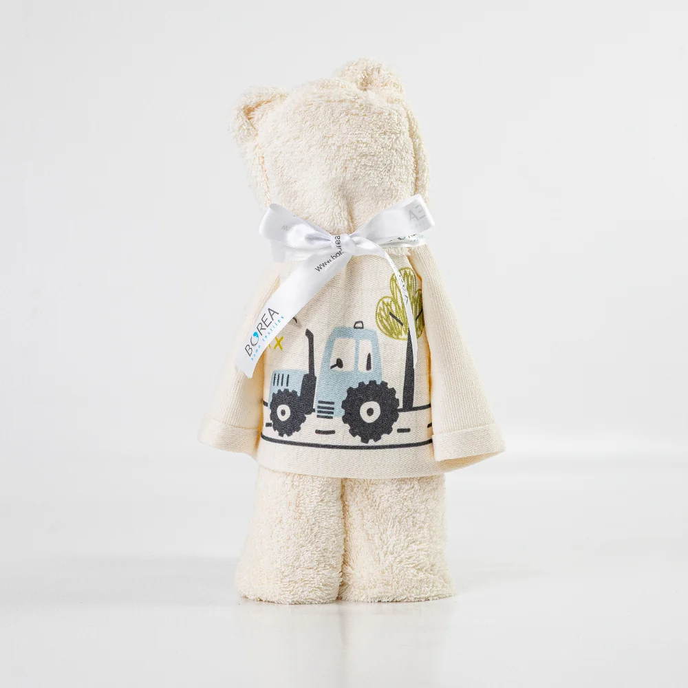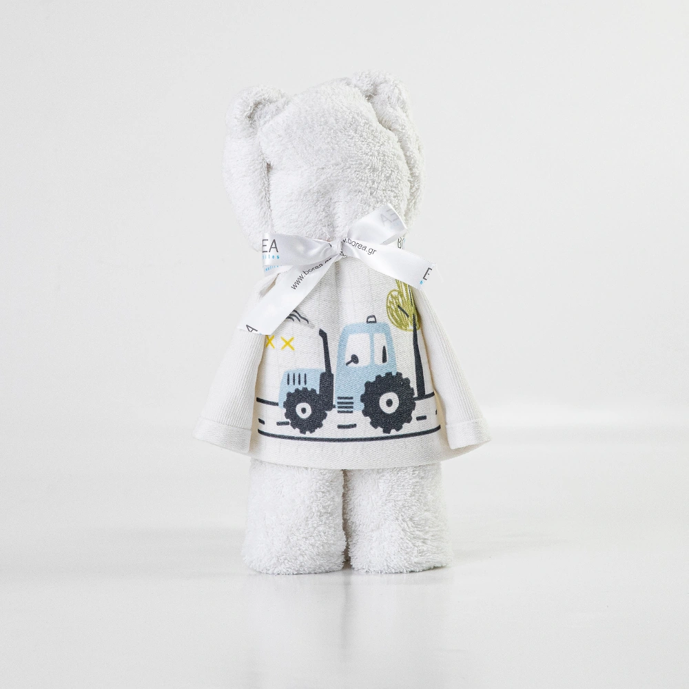 Πετσέτα προσώπου, από ύφασμα φροτέ πενιέ, 100% βαμβακερό, μονόχρωμο, με ψηφιακή εκτύπωση, σχέδιο τρακτέρ, σε συσκευασία/σχήμα αρκουδάκι.Διατίθεται σε 2 χρώματα.