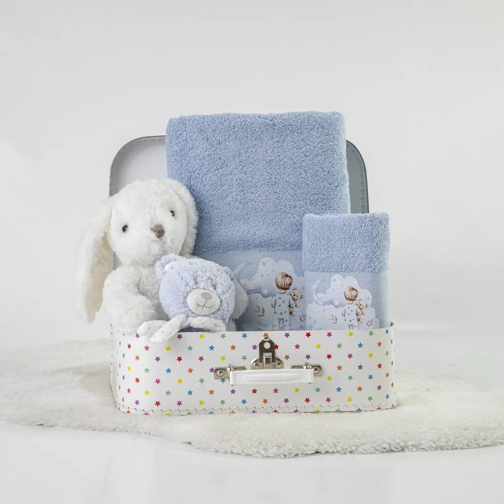 Σετ πετσέτες 2 τεμαχίων, μπάνιου και χειρός, από ύφασμα φροτέ πενιέ, 100% βαμβακερό, μονόχρωμο, σιέλ, με απλικέ, σχέδιο με παιδάκια με βρεφικές πιτζάμες. Διατίθεται σε 2 χρώματα.