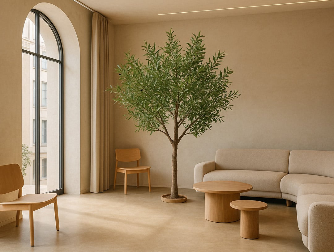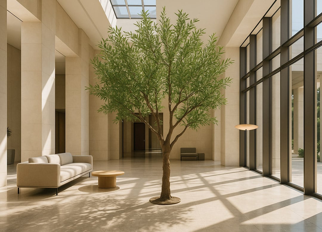 Η τεχνητή ελιά με τη διχρωμία πρασίνου στις δύο όψεις των φύλλων της, δείχνει μοναδικά ρεαλιστική και ιδιαιτέρως επιβλητική λόγω του μεγέθους της.